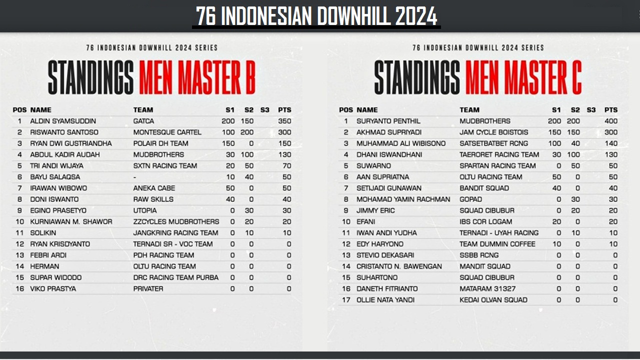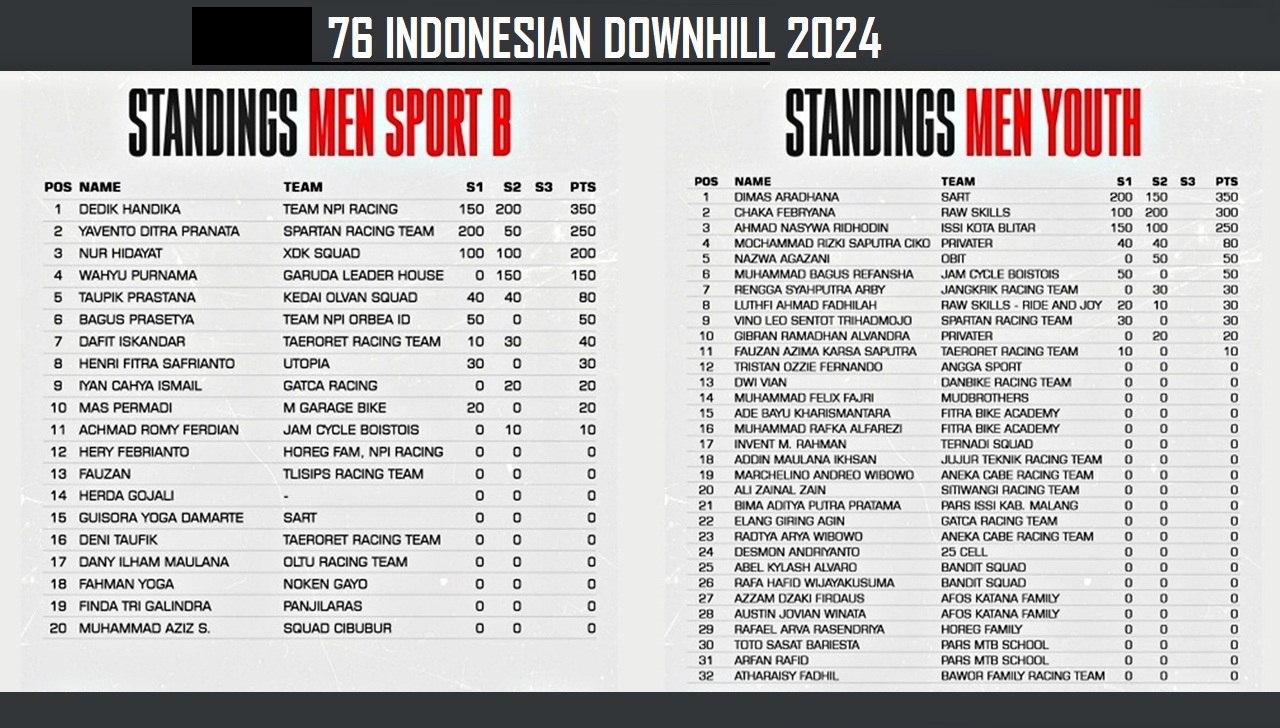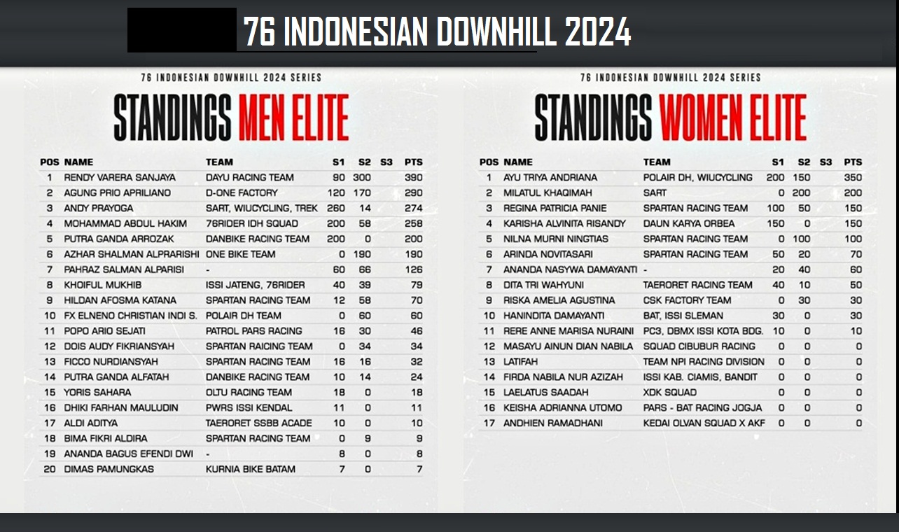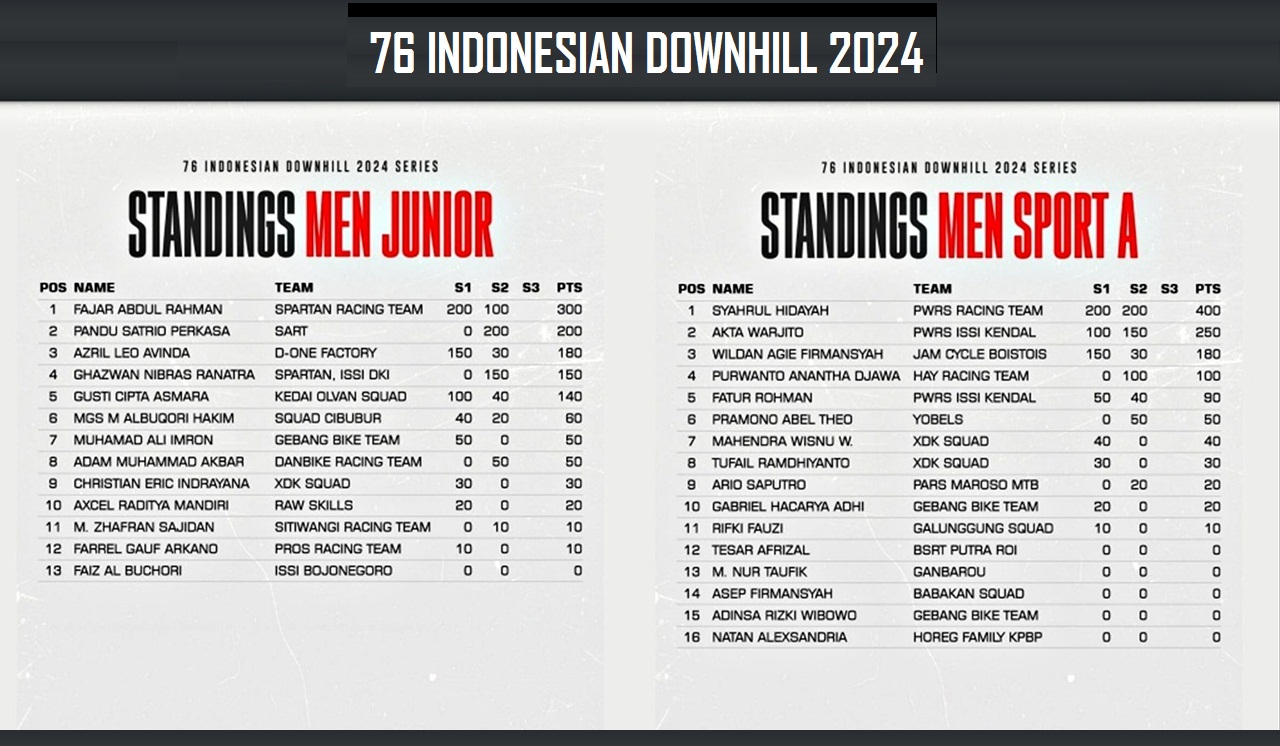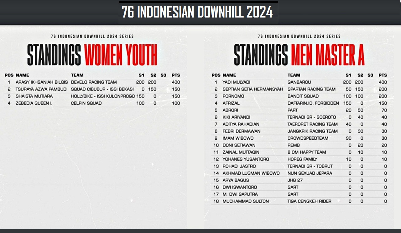 STANDING : Klasemen umum dari dua series 76 Indonesian Downhill 2024 Elite Men dan Elite Women, Series-1 Yogyakarta dan Series-2 Kudus 1,sebelum penentuan juara di Putaran Final dan Series-3 di Klemuk Bike Park, Kota Batu, Jawa Timur. (Gambar : Dok. 76rider/G-Sports.id)STANDING : Klasemen umum dari dua series 76 Indonesian Downhill 2024 Men Youth dan Men Sport B, Series-1 Yogyakarta dan Series-2 Kudus 1,sebelum penentuan juara di Putaran Final dan Series-3 di Klemuk Bike Park, Kota Batu, Jawa Timur. (Gambar : Dok. 76rider/G-Sports.id)STANDING : Klasemen umum dari dua series 76 Indonesian Downhill 2024 Women Youth dan Men Master A, Series-1 Yogyakarta dan Series-2 Kudus 1,sebelum penentuan juara di Putaran Final dan Series-3 di Klemuk Bike Park, Kota Batu, Jawa Timur. (Gambar : Dok. 76rider/G-Sports.id)STANDING : Klasemen umum dari dua series 76 Indonesian Downhill 2024 Men Junior dan Men Sport A, Series-1 Yogyakarta dan Series-2 Kudus 1,sebelum penentuan juara di Putaran Final dan Series-3 di Klemuk Bike Park, Kota Batu, Jawa Timur. (Gambar : Dok. 76rider/G-Sports.id)STANDING : Klasemen umum dari dua series 76 Indonesian Downhill 2024 Men Master B dan Men Master C, Series-1 Yogyakarta dan Series-2 Kudus 1,sebelum penentuan juara di Putaran Final dan Series-3 di Klemuk Bike Park, Kota Batu, Jawa Timur. (Gambar : Dok. 76rider/G-Sports.id)