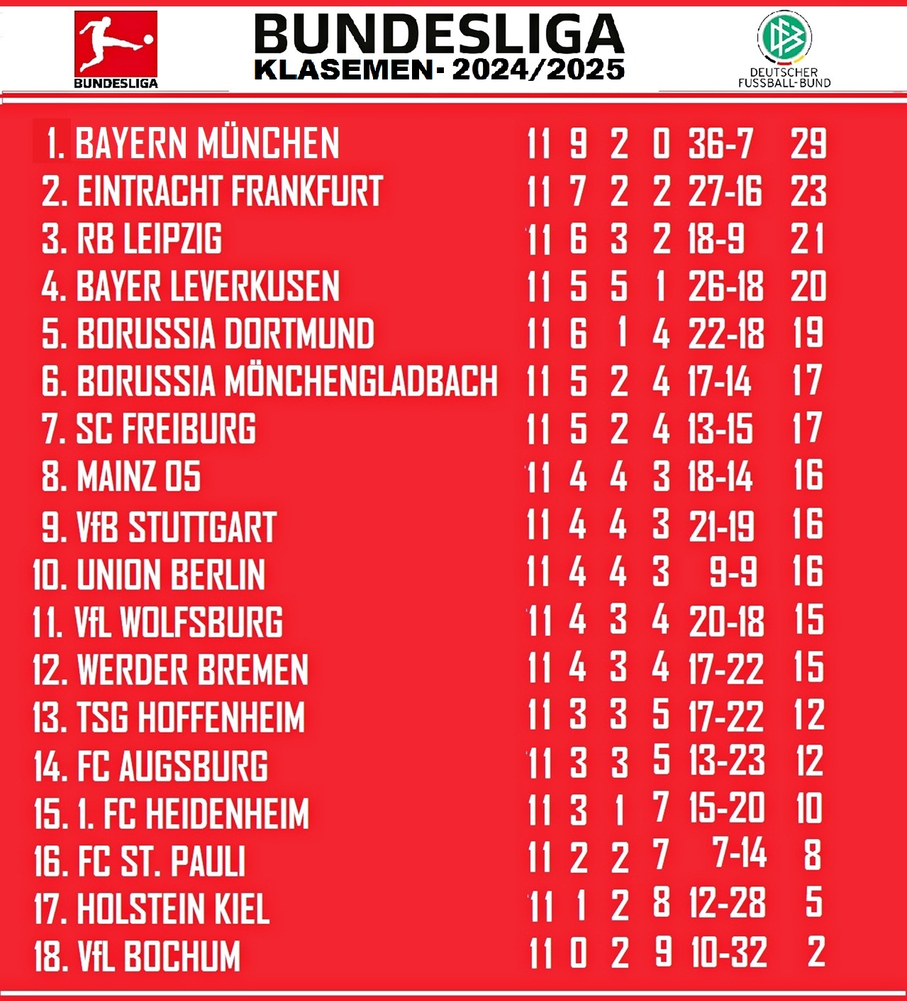 Juga di bawah posisi kedua, Eintracht Frankfurt mengemas poin 23 dan selisih gol 27-16) dan urutan ketiga RB Leipzig nilai 21 (18-9). Sedangkan tiga tim terbawah yang menghuni zona degradasi, ke-16 FC St. Pauli (poin 8), ke-17 Holstein Kiel (poin 5), dan juru kunci atau urutan ke-18 VfL Bochum dengan nilai 2.
