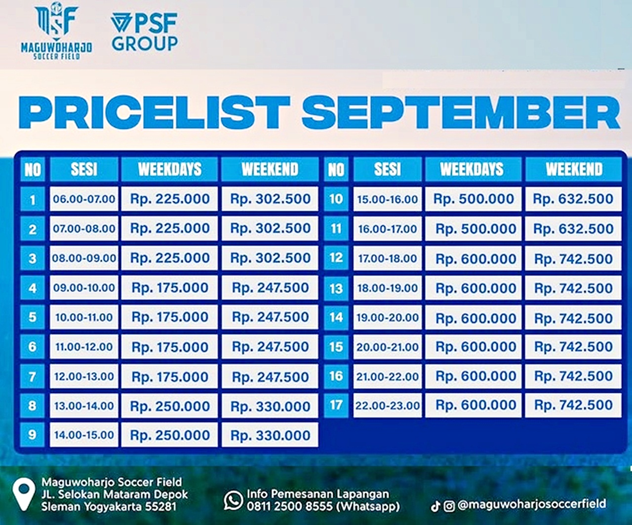 SLEMAN (YOGYAKARTA), G-SPORTS.ID – “Halooo guyssss ada kabar gembira nih untuk kalian!!!. Maguwoharjo Soccer Field (MSF) telah membuka jadwal dan price list bulan September 2025. Yuk ajak bersama teman kalian dengan bermain bola di Maguwoharjo Soccer Field!”.