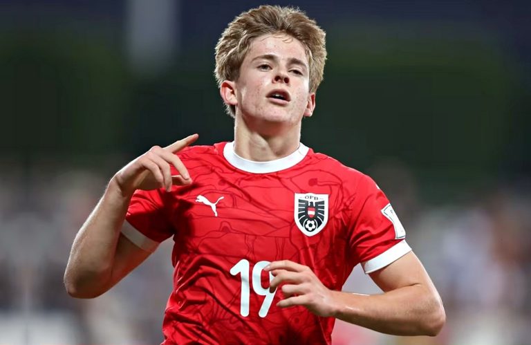 LOLOS KE FINAL : Bomber haus gol Austria U-178, Johannes Mathias Moser cetak dua gol kemenanga timnya 2-0 atas Italia U-17, di pitch-5 Aspire Zone-Doha Sports City, Baaya (Al Rayyan), Qatar dalam semifinal FIFA U-17 World Cup 2025, Senin (24/11/2025) malam WIB. (Foto : Dok. fifa.com)